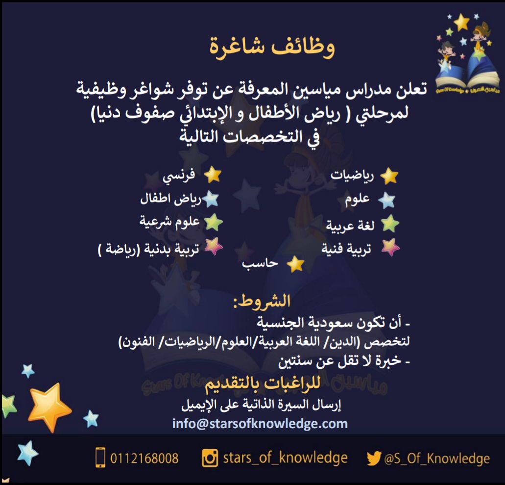 تعلن مدارس مياسين المعرفة عن توفر وظائف نسائية لمرحلتي (رياض الأطفال والإبتدائي صفوف دنيا) ، واشترط الإعلان أن تكون المتقدمة سعودية الجنسية ، للعمل في التخصصات التالية: