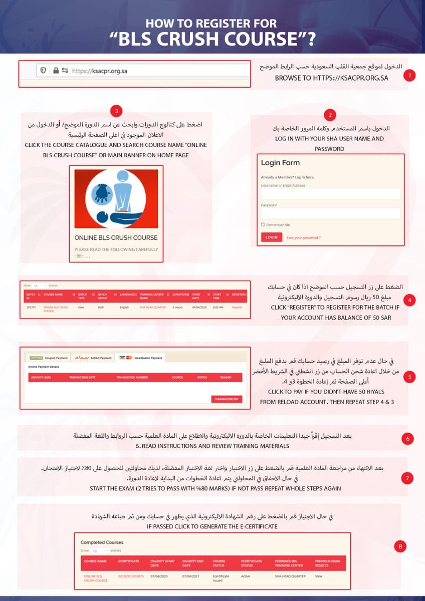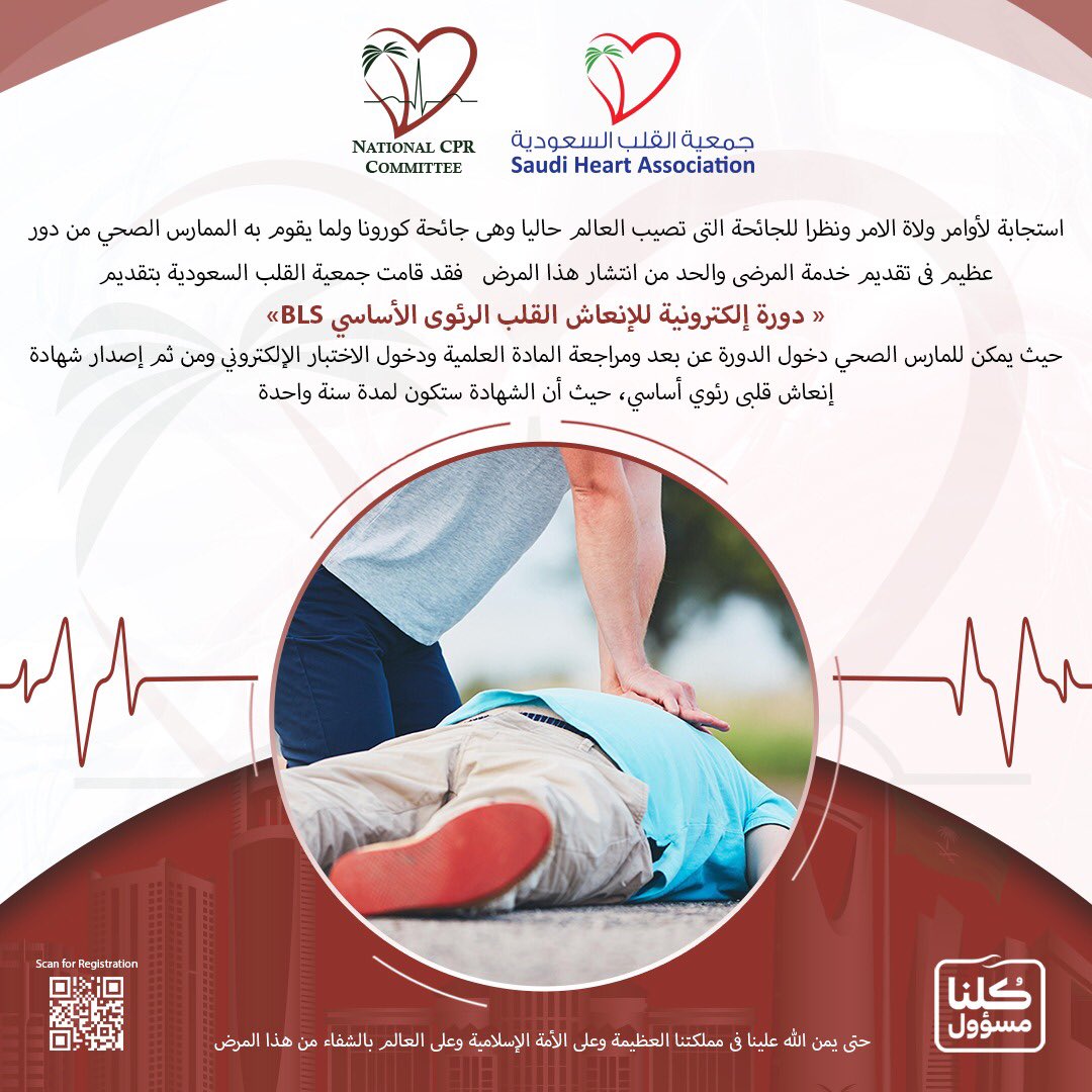 تعلن جمعية القلب السعودية واستجابة لأوامر ولاة الأمر ونظراً للجائحة التي تصيب العالم حالياً وهي جائحة (كورونا)، ولما يقوم به المُمارس الصحي من دور عظيم في تقديم خدمة المرضى والحد من انتشار هذا المرض، فقد قامت جمعية القلب السعودية بتقديم (دورة إلكترونية للإنعاش القلب الرئوي الأساسي (BLS)) ، حيث يمكن للمارس الصحي دخول الدورة (عن بُعد) ومراجعة المادة العلمية، ودخول الاختبار الإلكتروني ومن ثم إصدار شهادة (إنعاش قلبي رئوي أساسي)، حيث أن الشهادة ستكون لمدة (سنة واحدة)، التفاصيل أدناه: