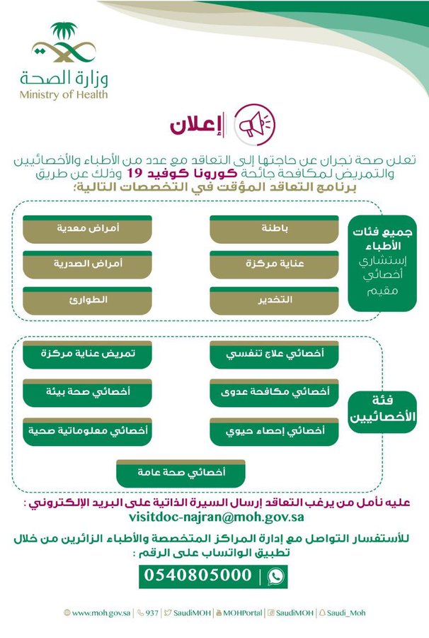 تعلن المديرية العامة للشؤون الصحية ” صحة نجران” بمنطقة نجران عن رغبتها في استقطاب عدد من الأطباء والتمريض والأخصائيين للعمل في مكافحة جائحة فيروس كورونا المستجد (COVID-19)، وذلك عن طريق برنامج التعاقد المؤقت في العديد من التخصصات، وعليه تأمل المديرية ممن يـرغب في التعاقد سواء من القطاع الخاص أو الحكومي، التفاصيل: