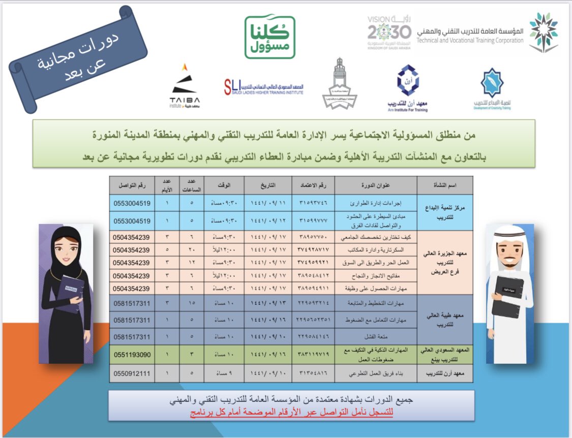 تعلن إدارة التدريب التقني بمنطقة المدينة المنورة توفر (12) دورة تدريبية مجانية (عن بُعد)، بشهادات مُعتمدة من المؤسسة العامة للتدريب التقني والمهني، التفاصيل أدناه: