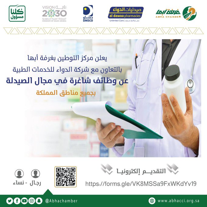 يعلن مركز التوطين في غرفة أبها بالتعاون مع (شركة الدواء للخدمات الطبية) عن وظائف شاغرة في مجال الصيدلة بجميع مناطق المملكة