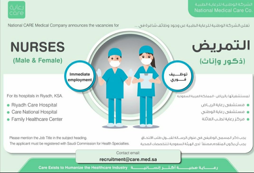 تعلن الشركة الوطنية للرعاية الطبية (رعاية) عن توفر وظائف (تمريض) شاغرة (للرجال والنساء) للعمل في مستشفيات الشركة بمدينة الرياض ،التفاصيل أدناه: