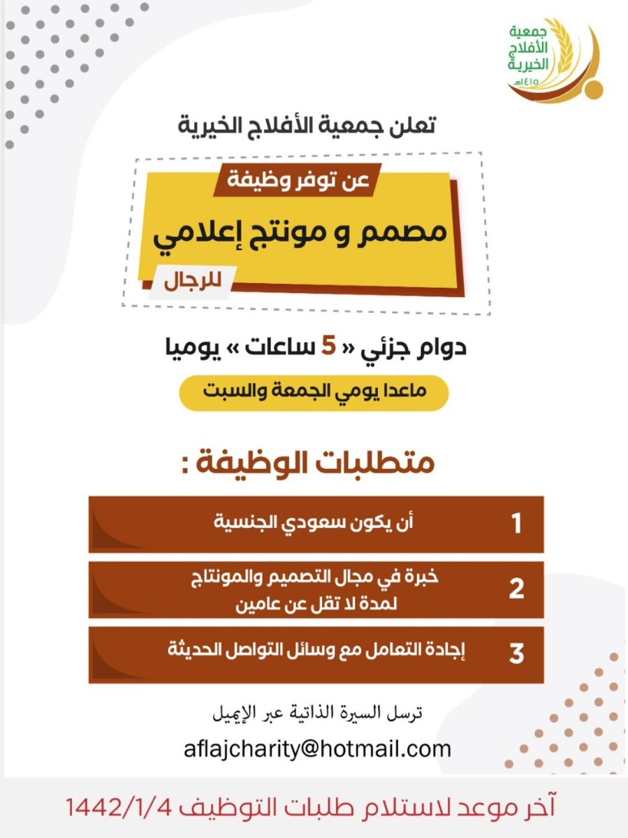 تعلن جمعية الأفلاج الخيرية توفر وظيفة شاغرة (دوام جزئي) بمجال التصميم والمونتاج ،(للرجال) والعمل بمسمى (مُصمم ومونتاج إعلامي)، واشترطت الجمعية أن يكون المتقدم سعودي الجنسية، التفاصيل أدناه: