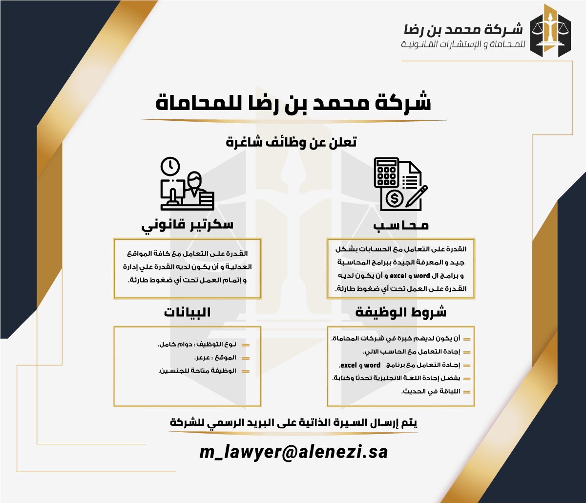 تعلن شركة محمد بن رضا للمحاماة عن توفر وظائف إدارية شاغرة في مدينة عرعر وذلك للعمل بالمسميات التالية – (محاسب – سكرتير قانوني) وذلك وفق التفاصيل أدناه: