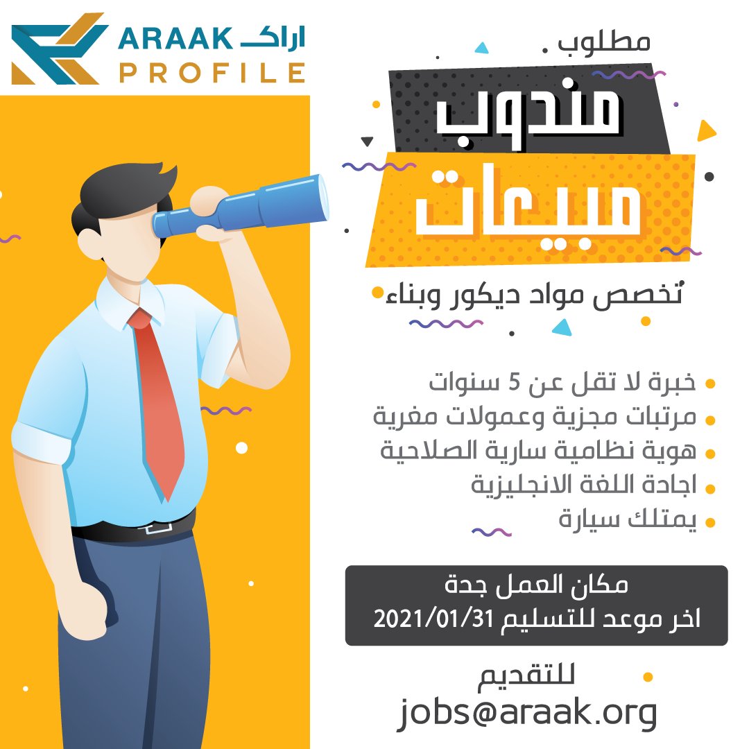 تعلن شركة اراك للتنمية (تعليم – تدريب – استشارات) عن توفر وظيفة شاغرة بمسمى (مندوب مبيعات) تخصص مواد ديكور وبناء وذلك للعمل في مدينة جدة وفق التفاصيل أدناه:
