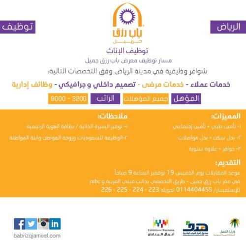 وظائف نسائية وظائف إدارية نسائية برواتب تصل 6000 ريال آخر تحديث: 19 نوفمبر 2025 0 شركة باب رزق تعلن عن توفر وظائف إدارية بالمسميات “خدمة عملاء،خدمات مرضى،تصميم داخلي، وظائف إدارية،وتشمل جميع المؤهلات،براتب من 5000ريال إلى 6000 ريال، للعمل في مدينة الرياض ، والمقابلات غدا ، وفقا للتفاصيل أدناه: 💕تابعنا على قناة تليجرام 🎶 0 مشاركة المقال