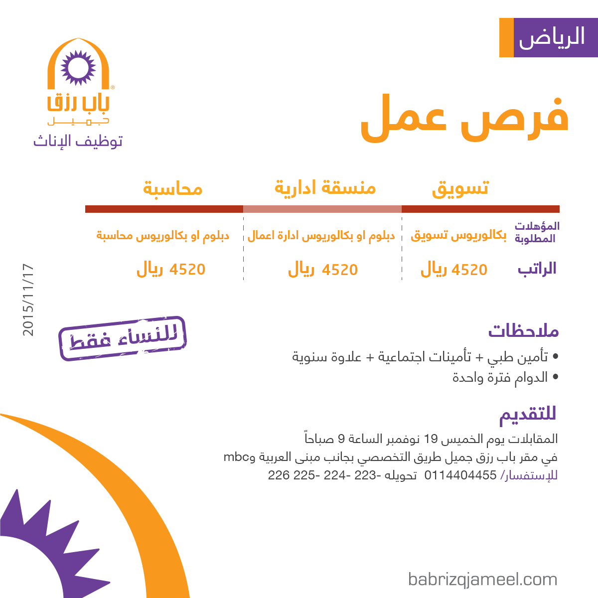وظائف نسائية وظائف إدارية للنساء في الرياض آخر تحديث: 19 نوفمبر 2025 2 يعلن باب رزق عن توفر وظائف إدارية للنساء بالمسميات “منسقة إدارية،تسويق،محاسبة” لحملة الدبلوم والبكالريوس في التخصص المناسب، مع راتب 4530ريال،والمقابلات غدا وفقا للتفاصيل أدناه: 💕تابعنا على قناة تليجرام 🎶 2 مشاركة المقال