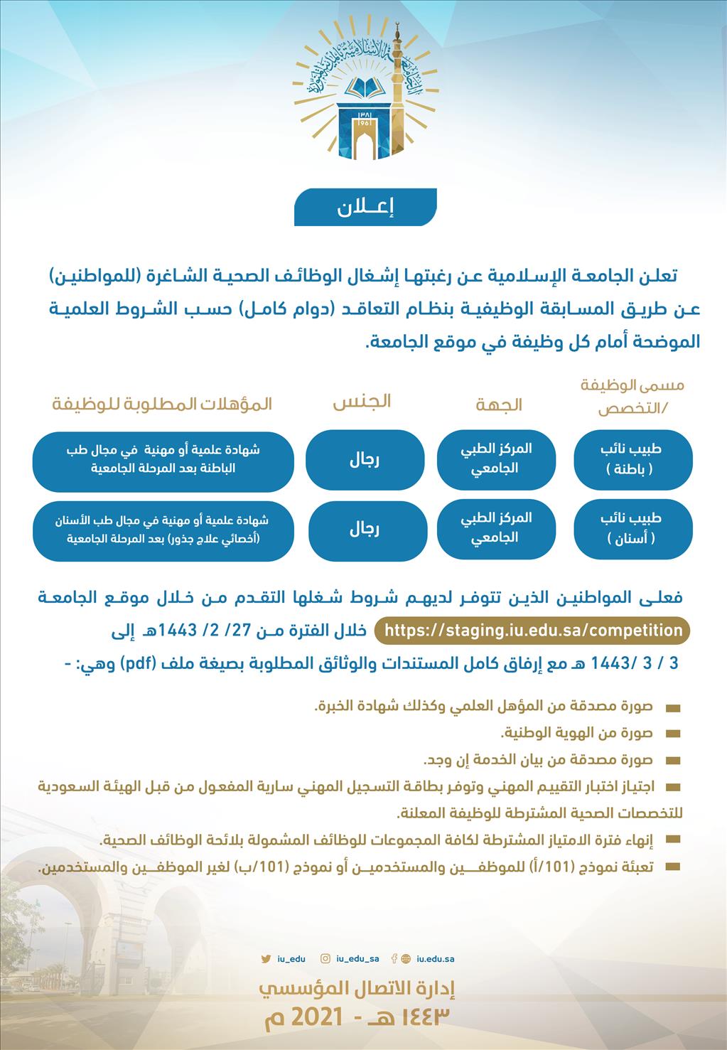 تعلن الجامعة الإسلامية توفر وظائف صحية شاغرة عن طريق (المسابقة الوظيفية)، بنظام التعاقد (دوام كامل) للعمل في المركز الطبي الجامعي،بحيث يكون المتقدم سعودي الجنسية،التفاصيل أدناه: