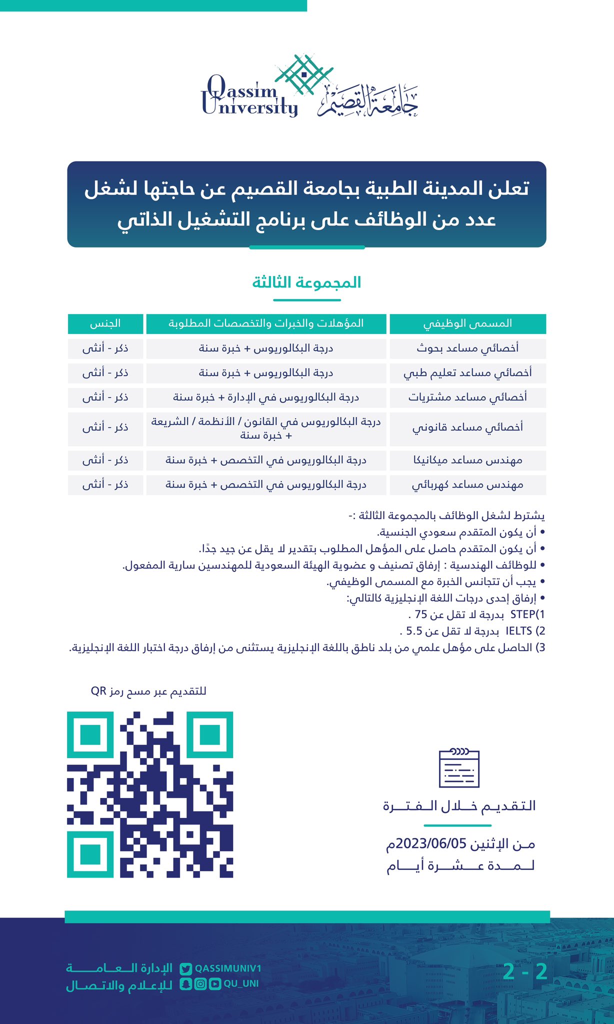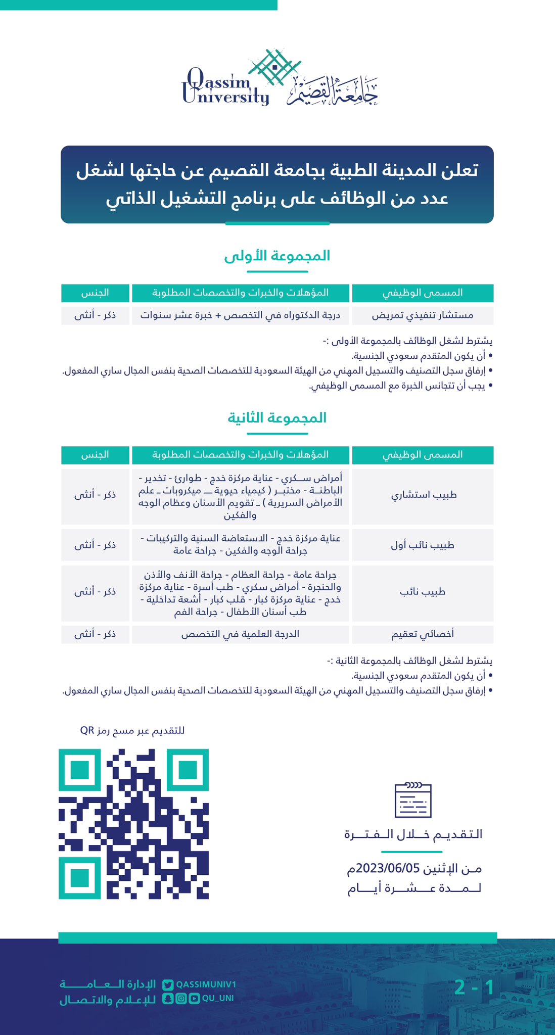 تعلن جامعة القصيم عن وجود العديد من الوظائف الإدارية، القانونية، الهندسية، والصحية شاغرة بها، وسوف يكون العمل في المدينة الطبية.